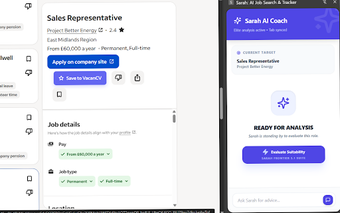 Wbudowane inteligentne okno boczne oferuje coaching, analizę luk w umiejętnościach oraz pytania do przygotowania na rozmowy kwalifikacyjne. Dodatkowo, dzięki funkcji Atomic Sync, wszystkie zapisane oferty są automatycznie przesyłane do VacanCV Tracker, co ułatwia generowanie dokumentów aplikacyjnych. Aby korzystać z pełni możliwości aplikacji, wymagane jest posiadanie darmowego konta VacanCV.